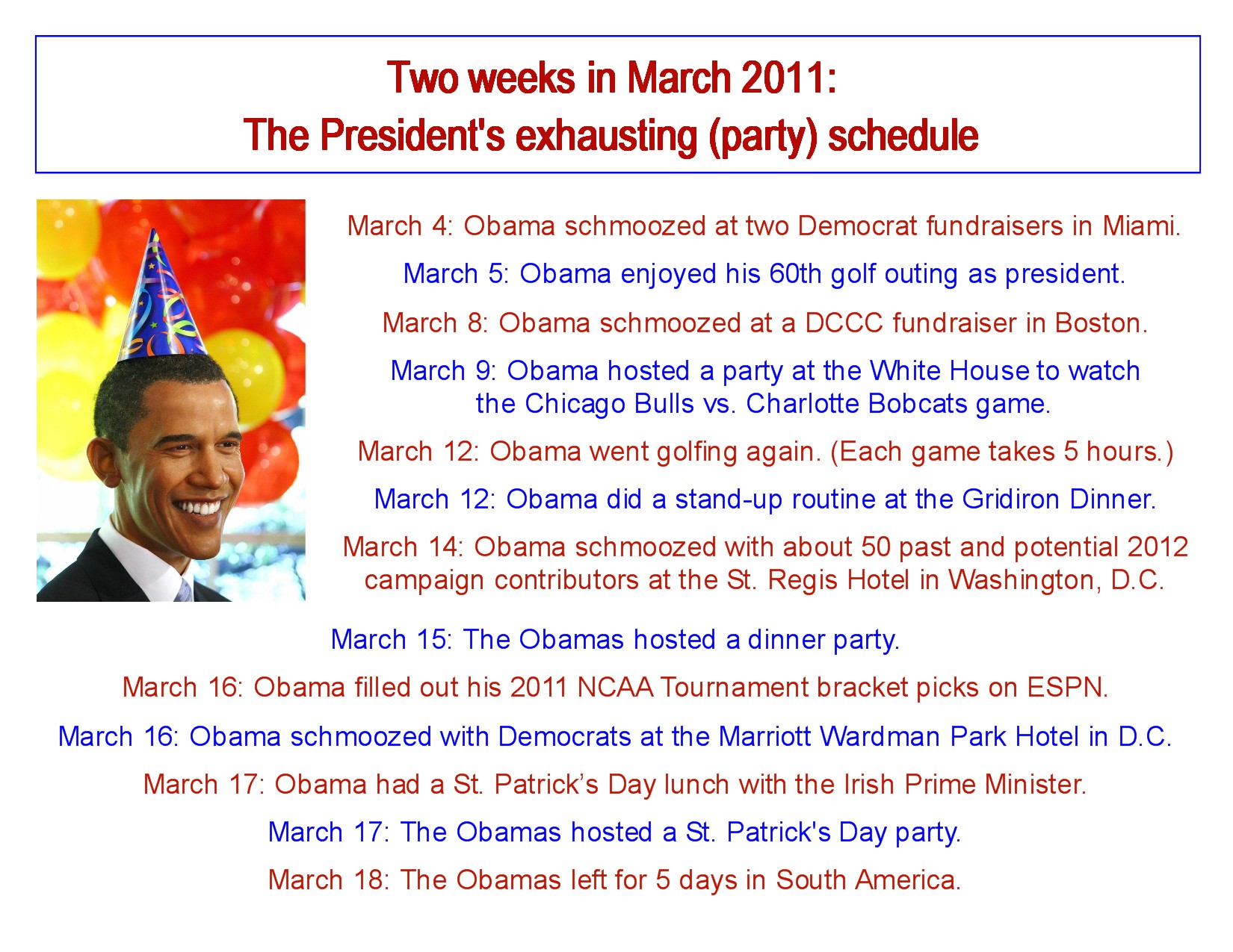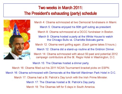 The Prez is way down south looking under every rock for those millions of jobs that went missing. The missus, granny, the godmother and the kids are checking out the possiblility that the elusive jobs are being hidden in the back pockets of entertainers or under buffet tables.