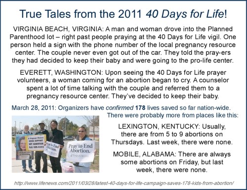 178 Americans owe their lives to people who agreed to stand on a sidewalk and pray for an hour. It’s pretty obvious to me why abortionists hate pro-lifers. We cost them business.