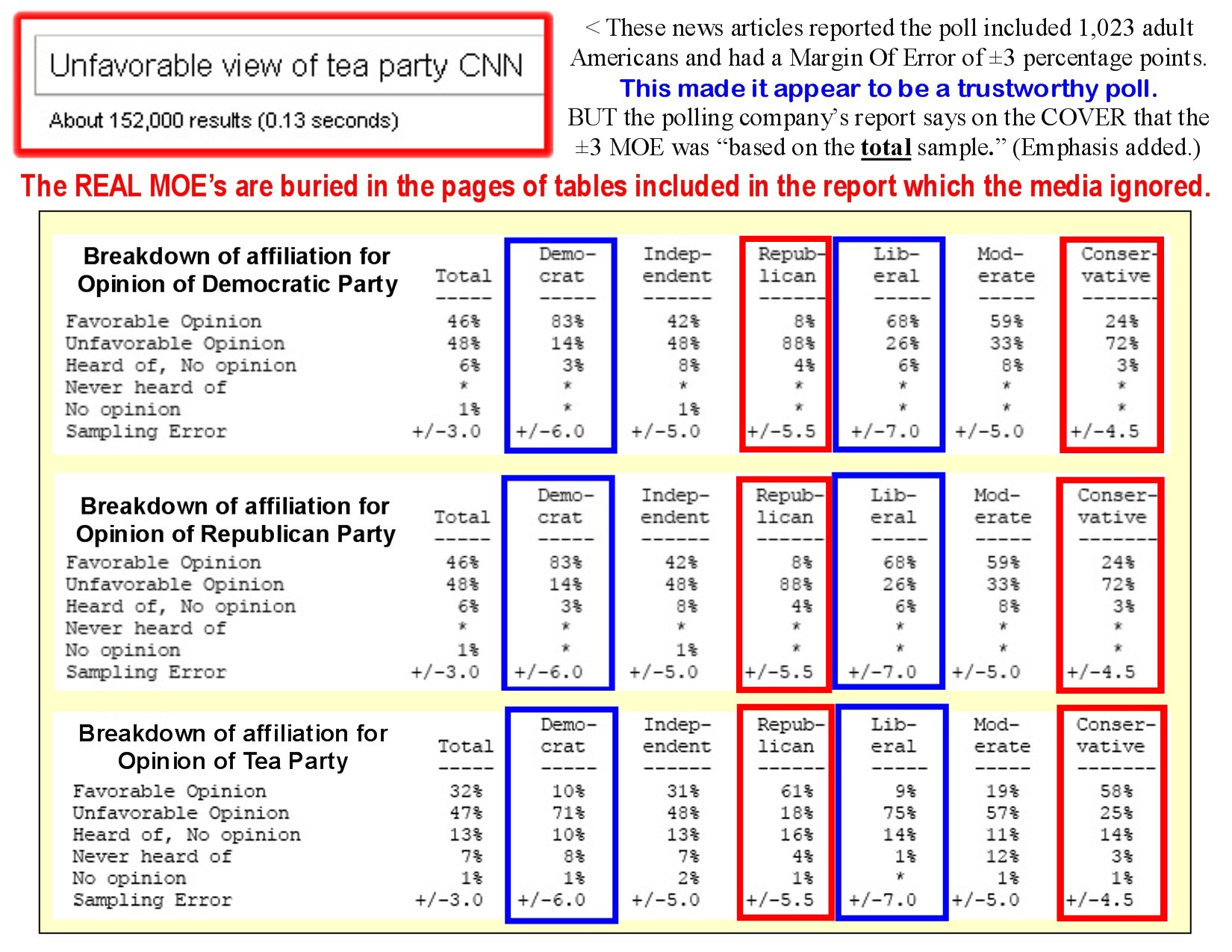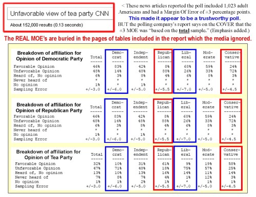 The Tea Party is very much a Right-wing group. But look how biased the weighting is. Conservative respondents have an MOE of ± 4.5 while Liberal respondents have an MOE of ± 7.0. (And get a load of all the hits I got when I googled “Unfavorable view of tea party CNN”!)