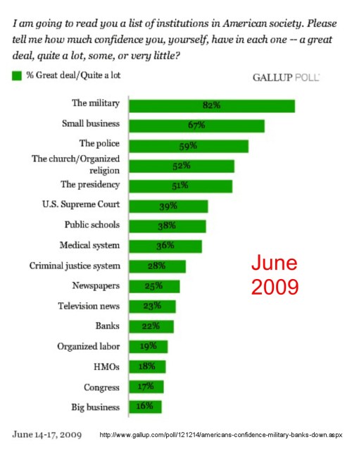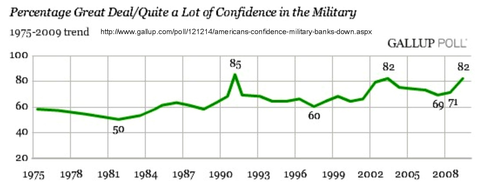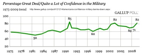 The LOWEST confidence in the military happened because of Carter’s ineptitude. Even when Bush, Gitmo, Haditha, Abu Ghraib, etc. were all being barbecued by the Left, confidence never dropped below 69%.