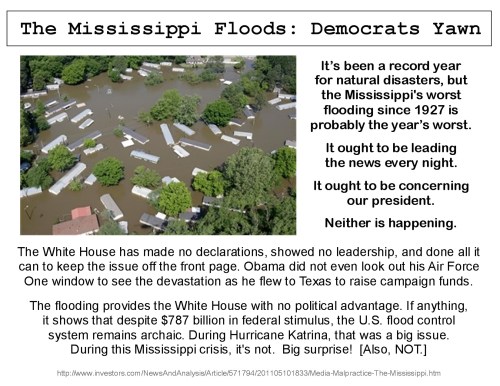 Two oil refineries and 100,000 acres of prime farm land are flooded. Obama has shown no leadership in the face of yet more hits to our already sky high gas and food prices.