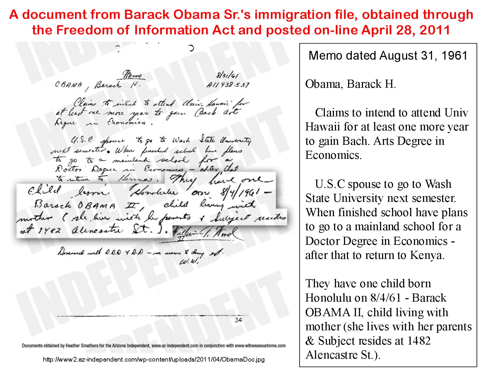 Another small point: The August 1961 memo says Barack Sr. told INS his new wife planned “to go to Washington State University next semester” while he would stay in Hawaii to finish his degree.