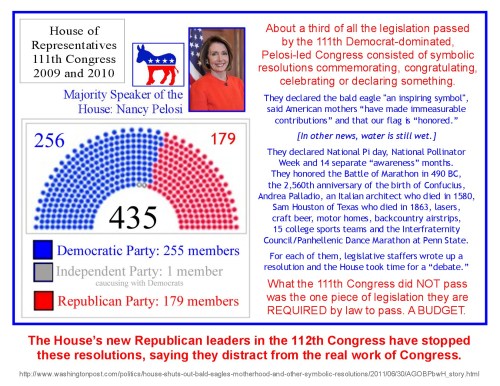 to include quick looks at each Congress from 1979 to now … who was president, which party controlled each house of Congress, who were the leaders in House and Senate and, for recent years (because Wikipedia had them), graphic depictions of the actual vote breakdowns by party.