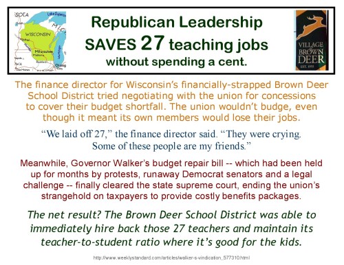 And those 27 jobs represent only ONE of Wisconsin’s school districts that has NOT had to lay off teachers to satisfy the hungry union beast.