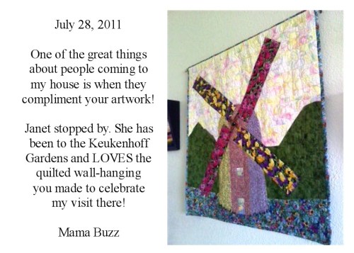 The window and door are photo fabric prints. The window is a pic someone else took of Mama Buzz at the Keukenhof Gardens and the door is a pic she took of the famous Muscari River.