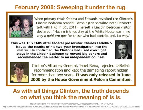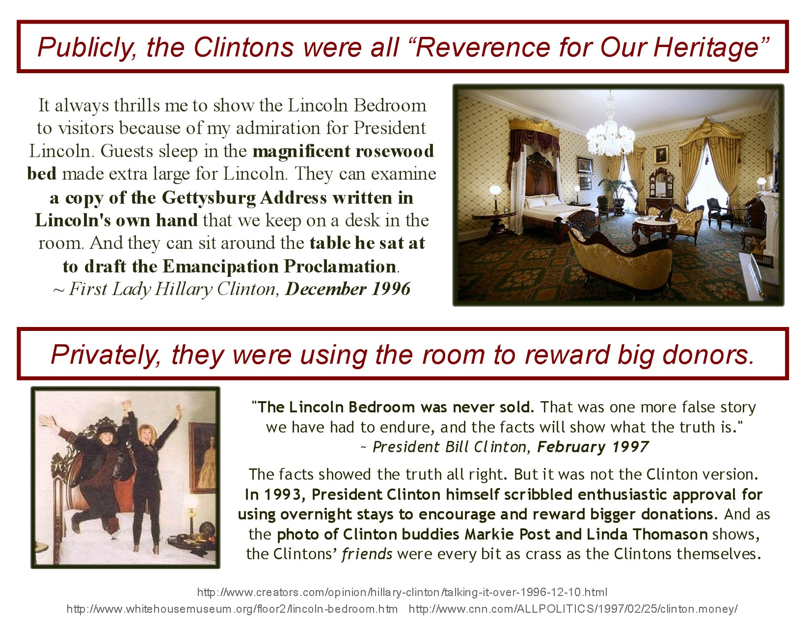 I never looked into the whole “Clintons renting Lincoln Bedroom” scandal before. I heard about it back when, but never knew any of the details. Turns out … the Rest of the Story spans more than a decade. And it ain’t pretty.