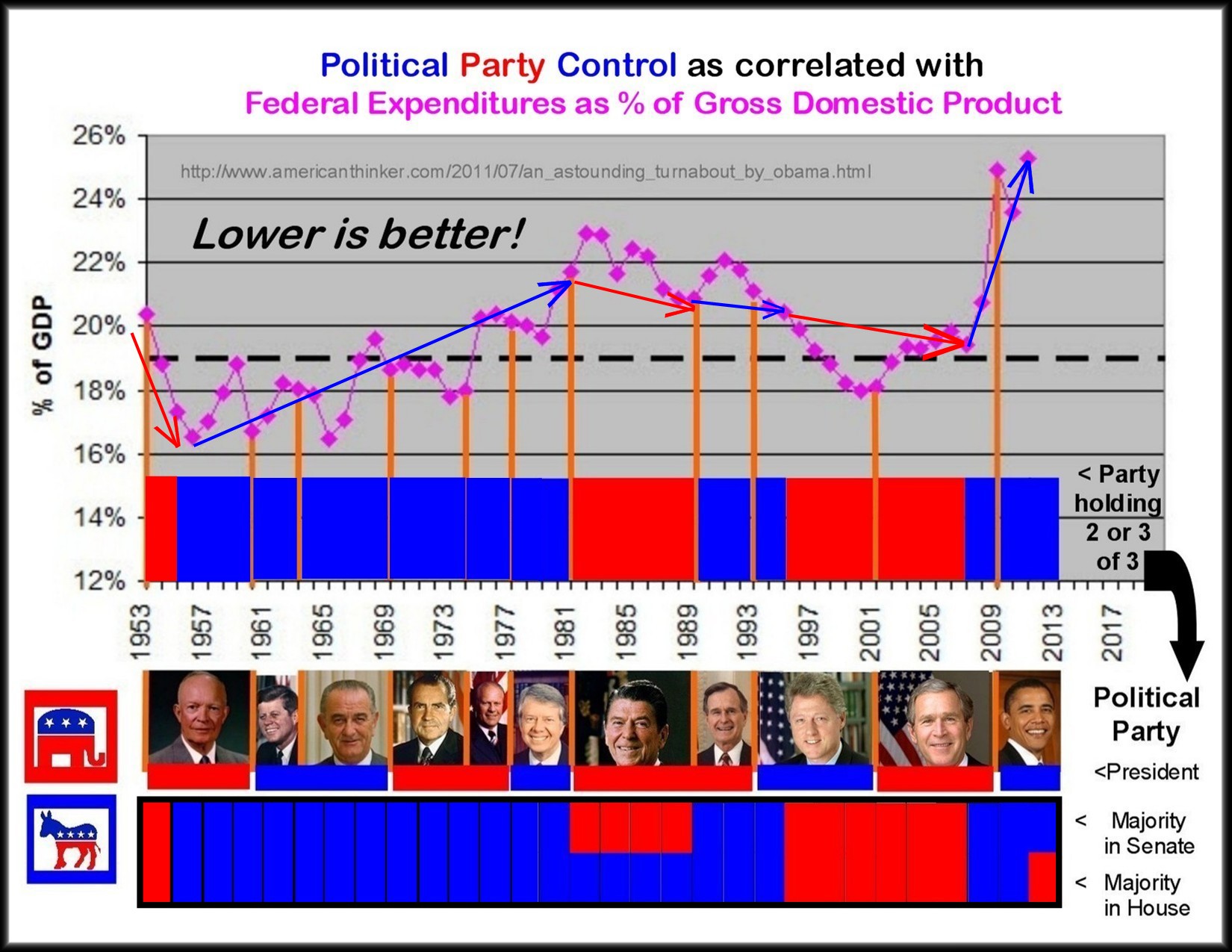 You may want to change one small thing… the Senate to blue for 2001 & 2002 (becuase it was initially split 50-50, but then Jeffords revealed his true colors, left the Republican party, and caucused with the Democrats). This didn’t change the fact that Republicans controlled the House and Presidency, and thus held the majority 2 out of 3 of the budget-making bodies, but did mean that Republicans did not have the rare trifecta of all three for those 2 years. And the Democrats controlled the Senate confirmation process (with Tom Daschle holding up scores of Bush judicial nominations).