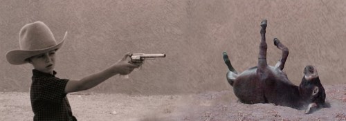 This is a test. Rough draft. Whatever you wanna call it. I like what I’ve got so far, esp how he’s aiming at a live donkey we can’t see. Like one down, etc. I think it still needs some background smoothing and I dunno … something. Border. Text. Ideas?