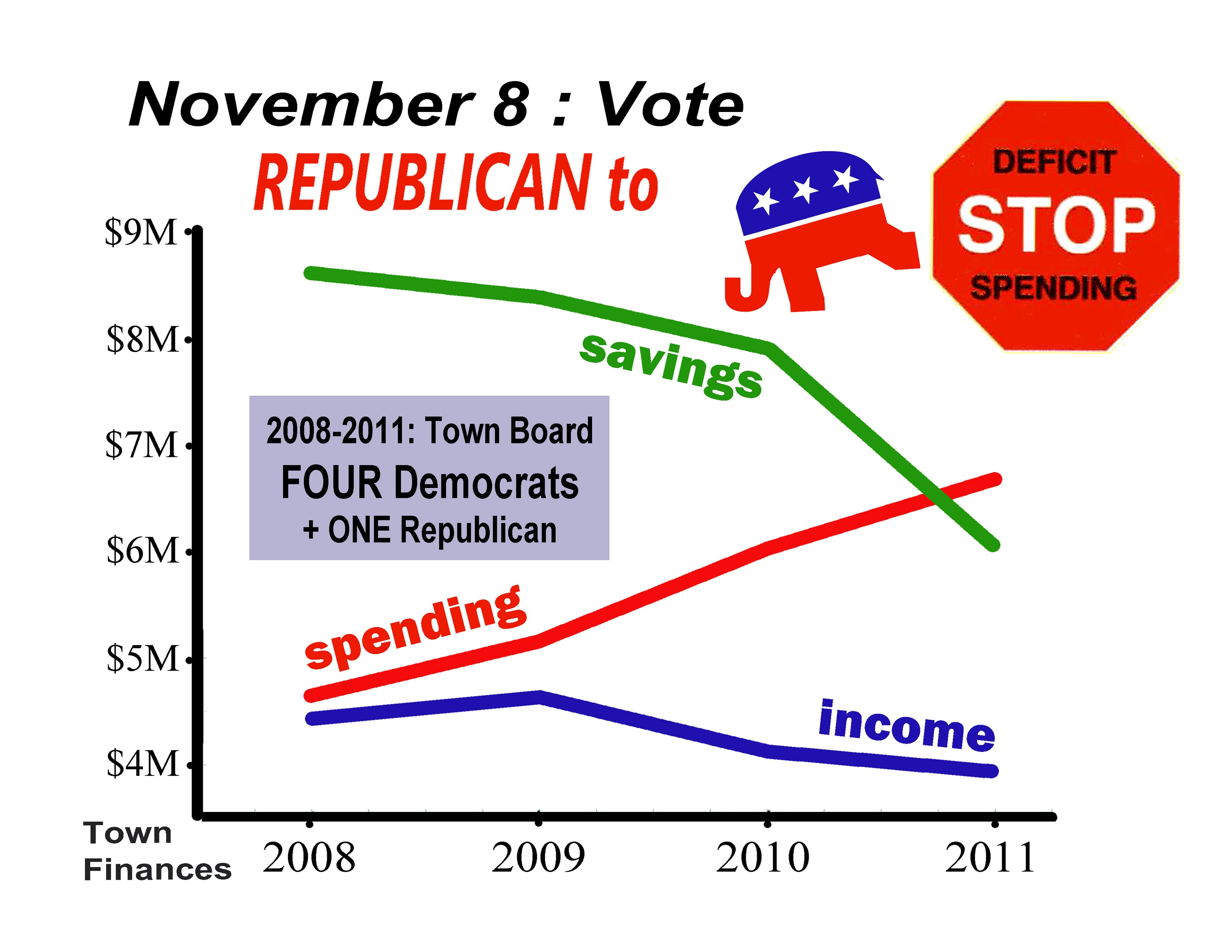 We’ve got town board elections in a week. Republicans have been out-numbered 4 to 1 for the past four years, during which time the Democrat majority has done what Democrat majorities seem to do everywhere they manage to get their sticky fingers on the public piggy bank. (Spend too much, then lie about it.)