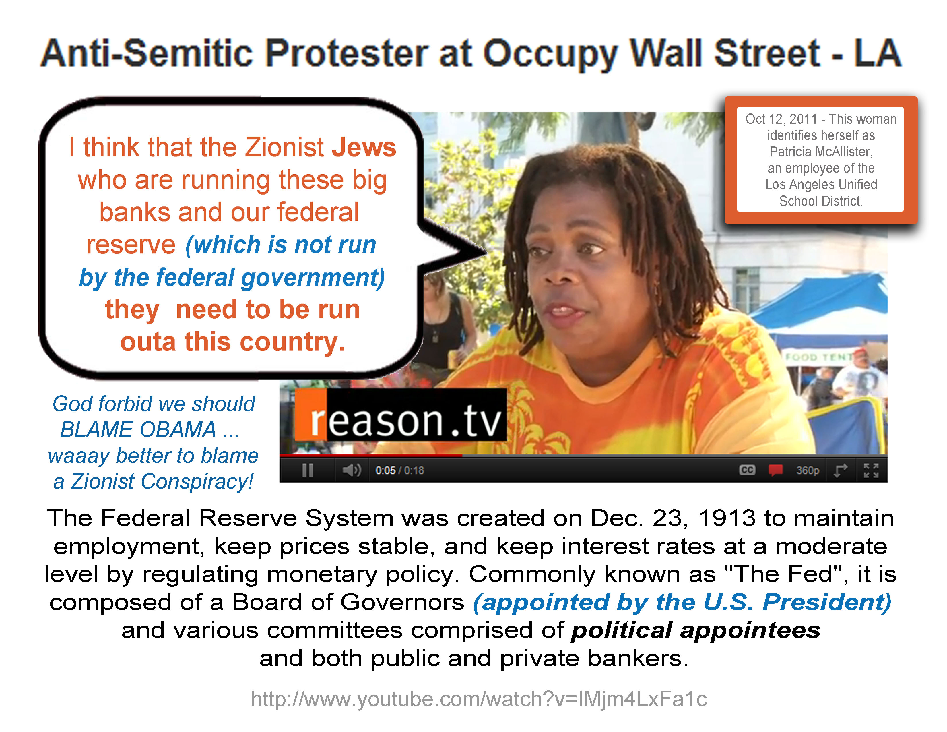 Personally, I found that the most chilling part of my research was hearing what that black woman in LA had to say about Zionist Jews and the Federal Reserve. I just can’t get past the feeling that this woman was parroting something she’d heard elsewhere … say from Democrat apologists?