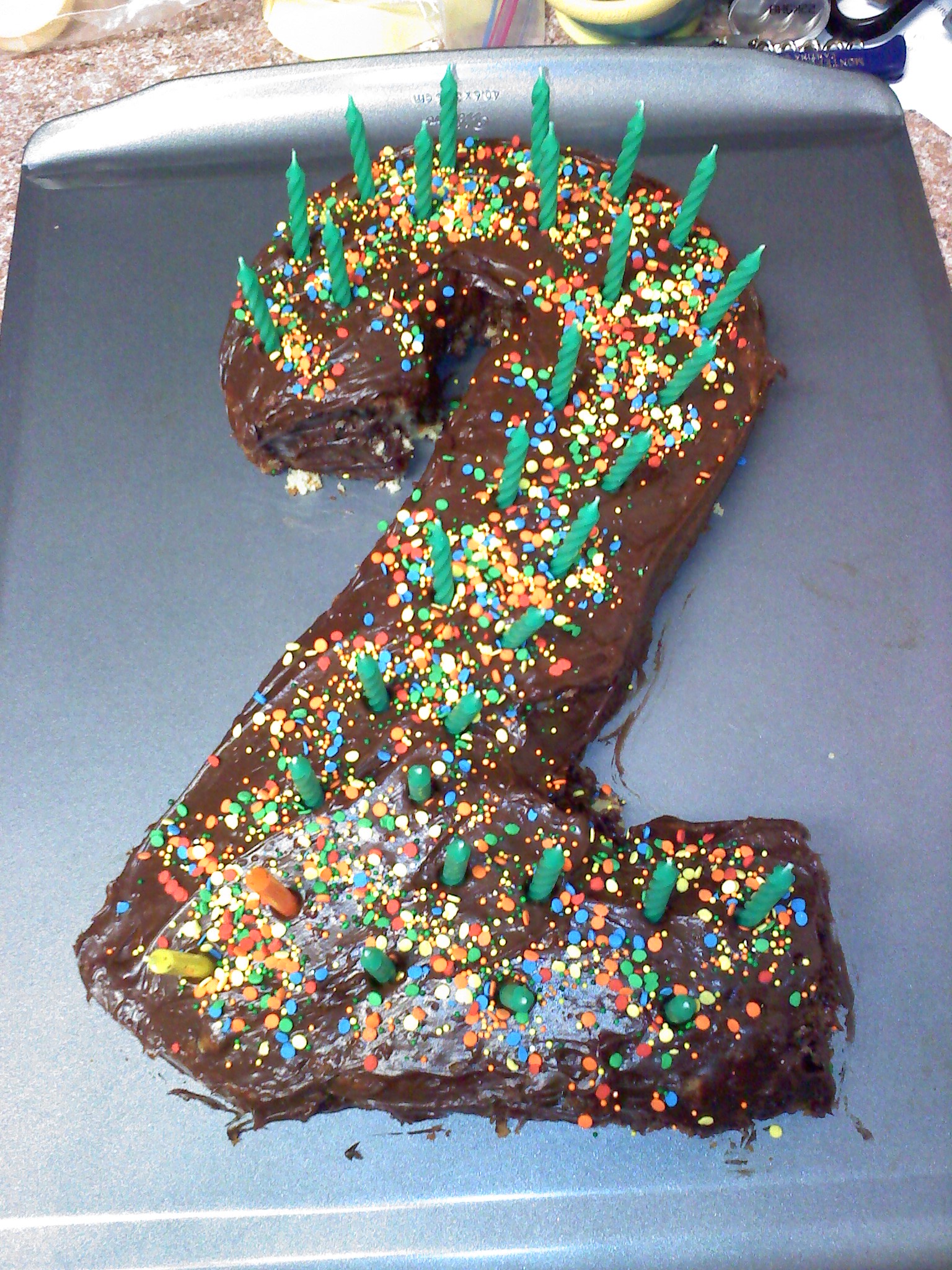 Mama and Baby Buzz almost share a birthday. She didn’t want two cakes in one week, so put her candles on his cake. π (His are the yellow and orange ones at the bottom.)