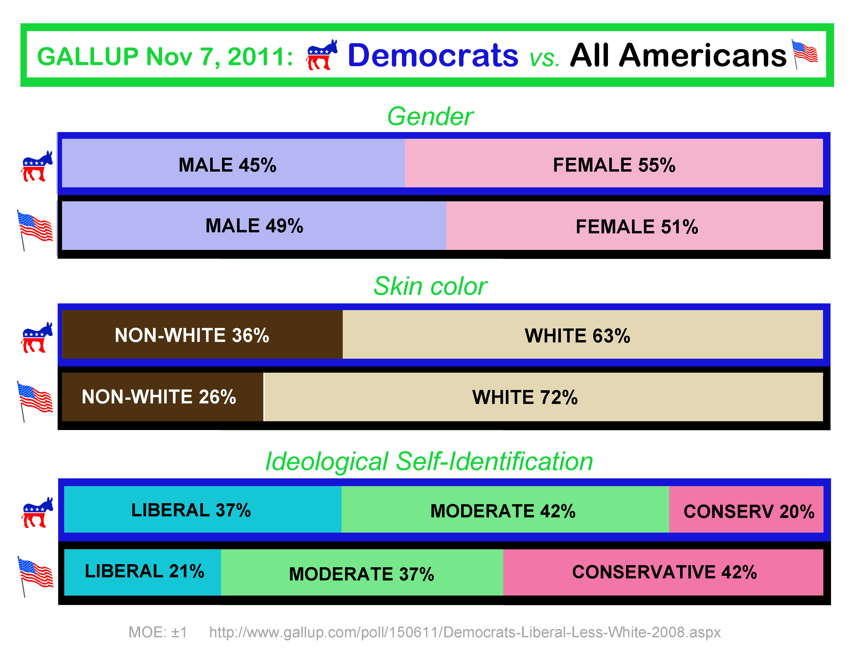 I have four thoughts about these statistics. One, women are in the majority, so let’s STOP allowing Dems to treat us like helpless victims. Two, whites are way in the majority and the President is non-white, so let’s STOP allowing Dems to condemn us as a racist nation. Three, Democrats are not representative of mainstream America, but we knew that. Four, what kind of brain-dead noodlehead Democrat self-identifies as Conservative?!