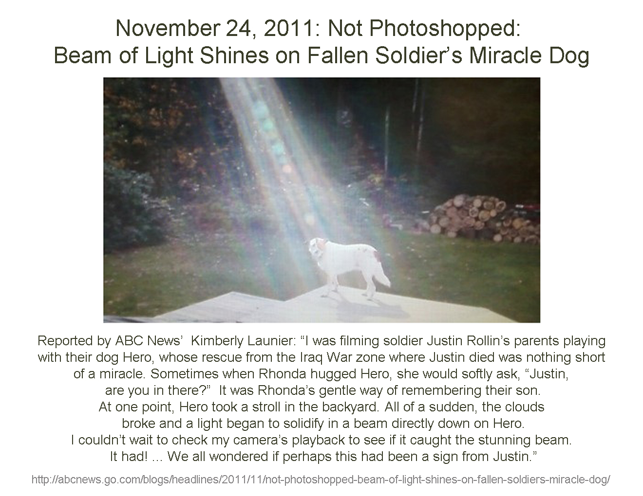 I’m really struck by the fact that an ABC reporter was there filming and the light hit that dog when he was on a sort of platform. I don’t think there’s any “perhaps” about it being a sign from Justin.