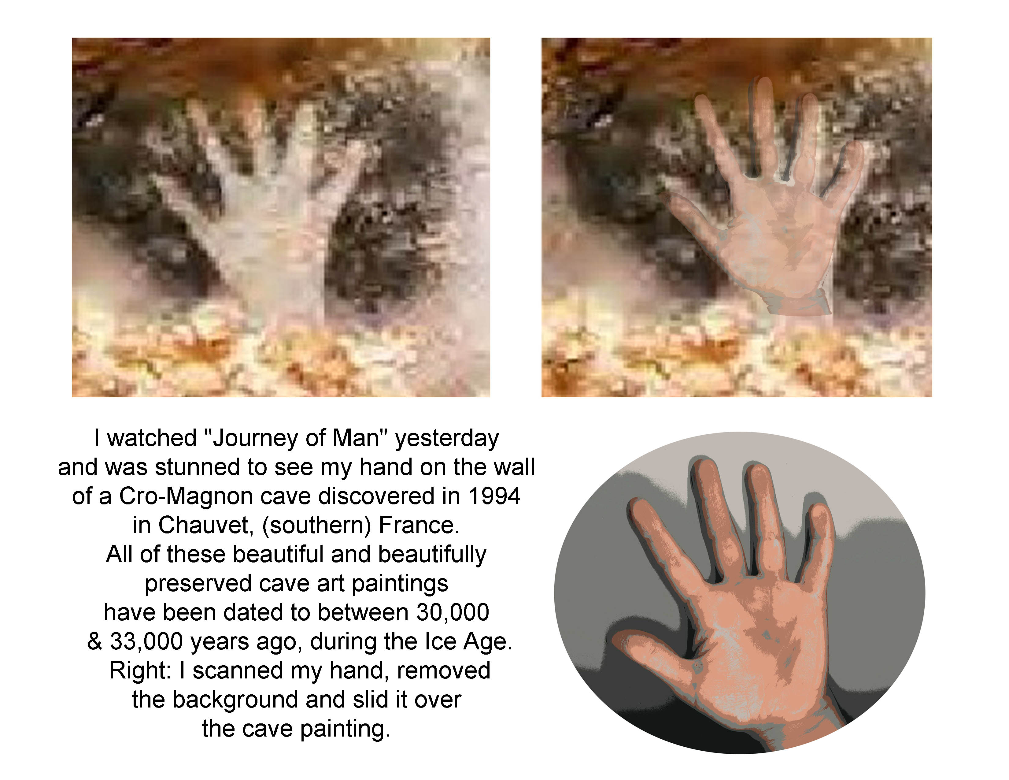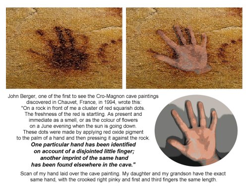 Lascaux is the one I learned about in college art classes. The one with the hand like mine that I saw in the documentary is Chauvet, which was just discovered in 1994.