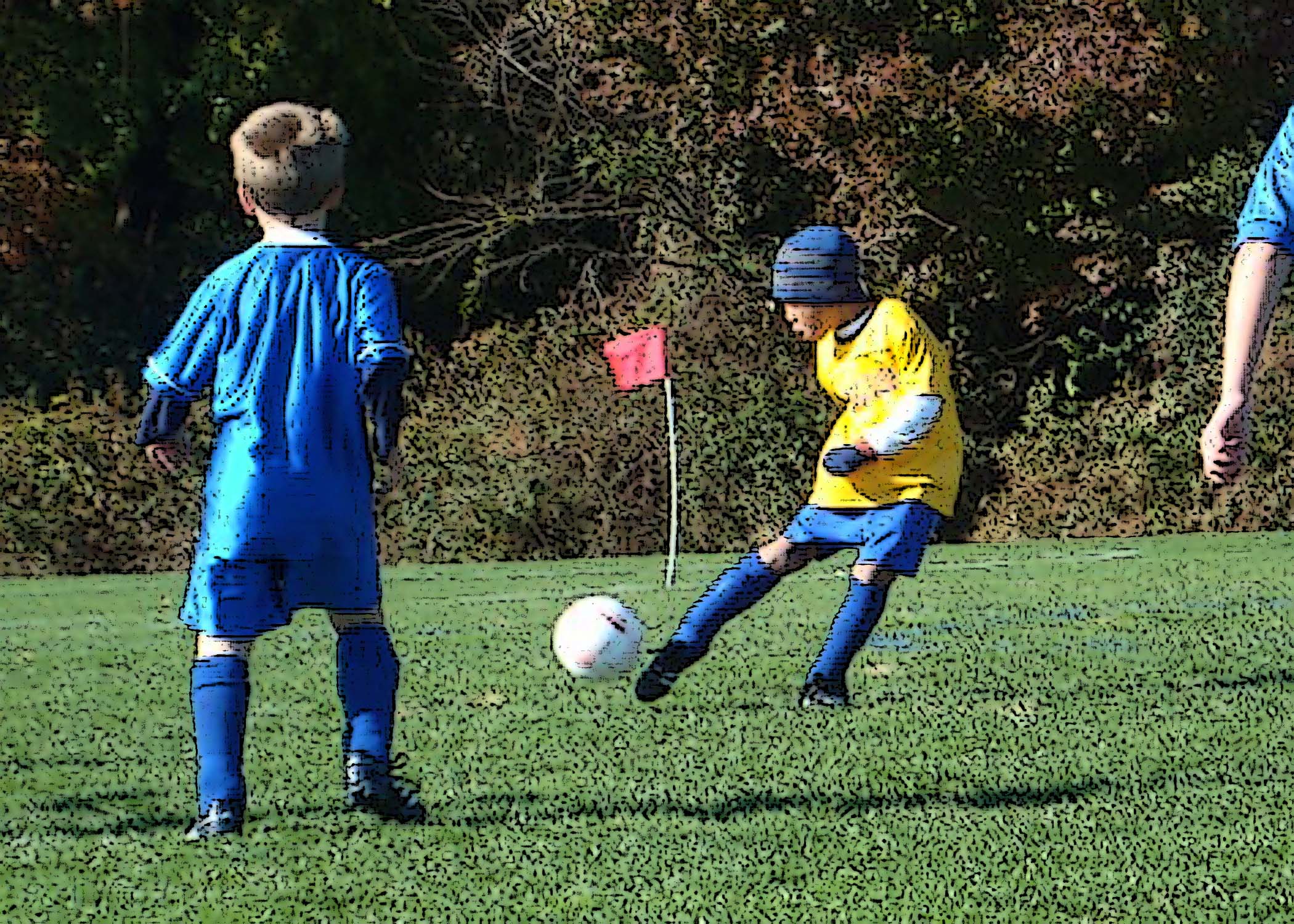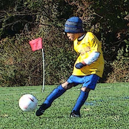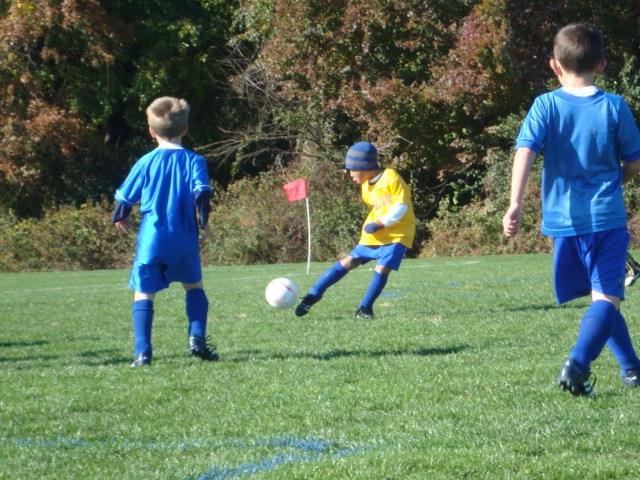 Add to photoshop: Dearest asked why I left the arm in on the right side of the crop. I don’t think he believed me that it makes the image more dynamic. Try blocking the arm out with your hand. See how the photo becomes a tale of two little kids, a kicker and someone who is not much of a threat? Now let the arm back in and you suddenly have motion and some sense of threat to the kicker from two blue players rushing into to block him.