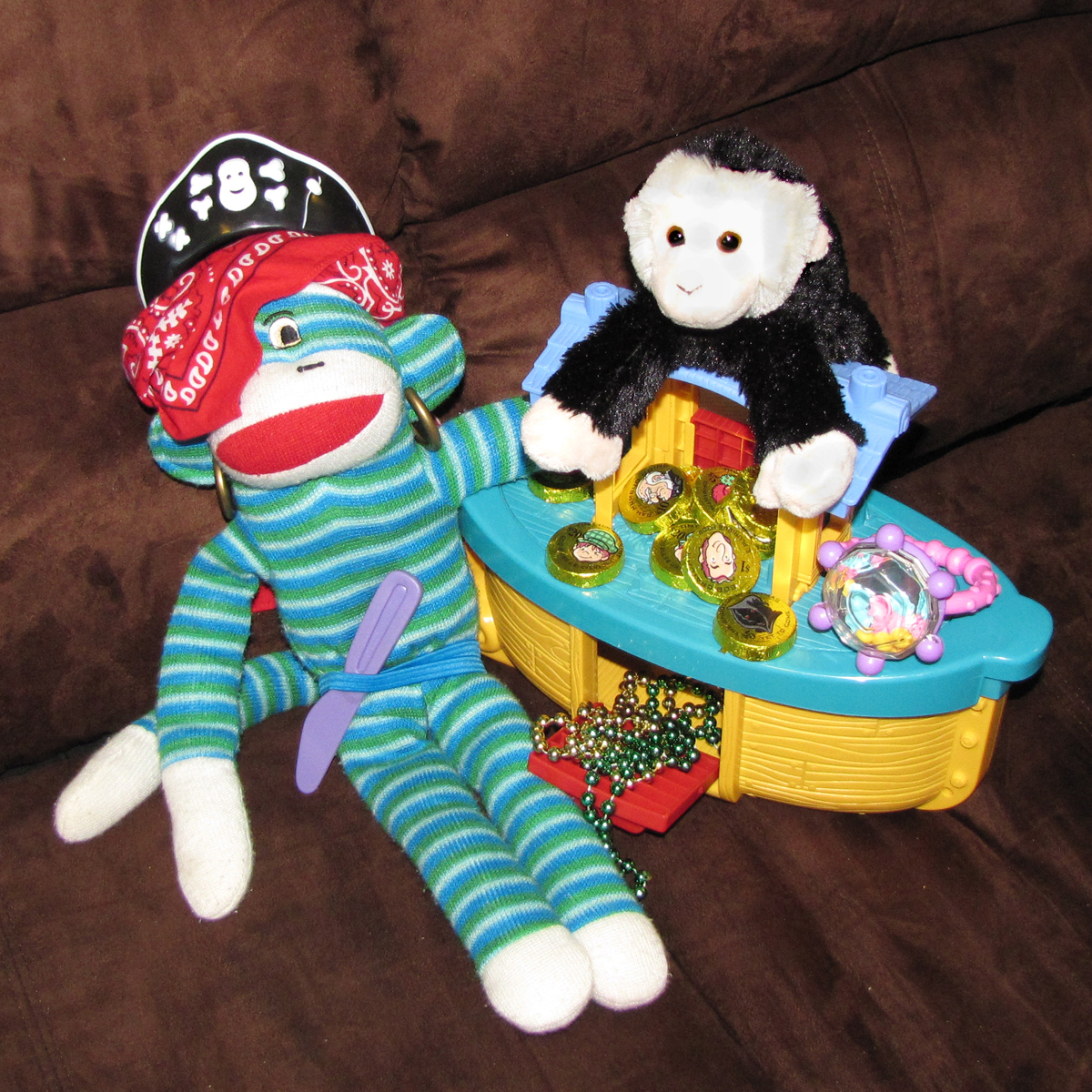 Mama Buzz tracked down and photographed the elusive pirate (Mr. Potatohead’s pirate set) sock monkey (Buzz’s stuffy)!