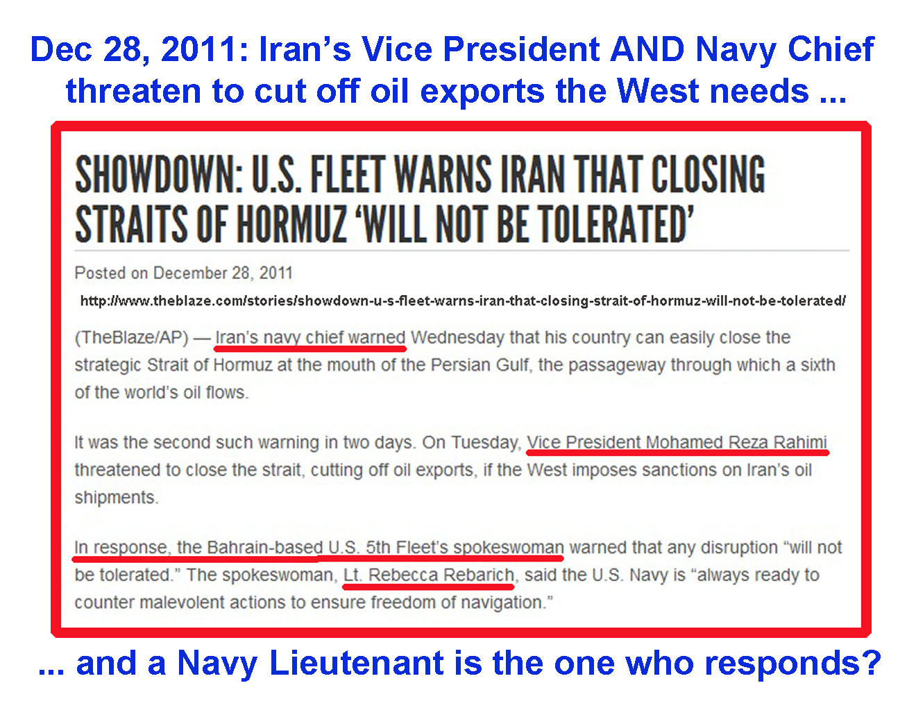 I don’t know much about foreign diplomacy, but it seems seriously whacked that Obama did not have our Vice President and/or Navy Chief respond to a threat of this magnitude. Click on graphic to embiggen.