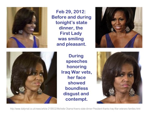 Chrissy, To me it looks like the disgust, the other nite, is with the darling husband. If you look at photos and film of the evening it looks like there are two separate men being Obama and she shows this face when a certain one is talking. I am half joking and half thinking it possible because the pics just don’t line up. I have tried to figure out why they are not the same man but can’t pinpoint to articulate. Since the first of the year Obo has been more ‘white’ and maybe she can’t stomach that??? At this point they could replace Obo with an Asian man and everyone would still see the imposter as Dear Leader and not even acknowledge the change. It is a bizarre world we live in. Should I get another cup of coffee on my way to the tinnie closet?
