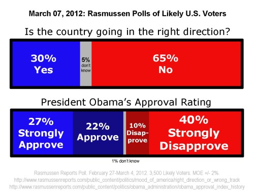 THE BAD NEWS is that, while 65% say the country is going in the wrong direction, 15% turn around and give Obama a positive approval rating and 5% are so out-to-lunch they actually give him good to excellent ratings on the economy!