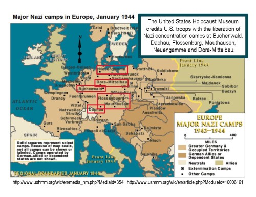 The United States Holocaust Memorial Museum and the Center of Military History credits American troops with the liberation of Nazi concentration camps at Buchenwald, Dachau, Flossenbürg, Mauthausen, Neuengamme and Dora-Mittelbau.