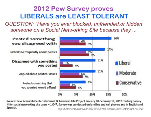Hot Air’s Ed Morrissey writes, “It’s a well-known fact that liberals are more tolerant than conservatives or moderates. Superior liberal tolerance is such a fact that they will scream at you if you dare to disagree or debate them, demand that your advertisers bail on you, and pressure the FCC to get you banned from the airwaves.”