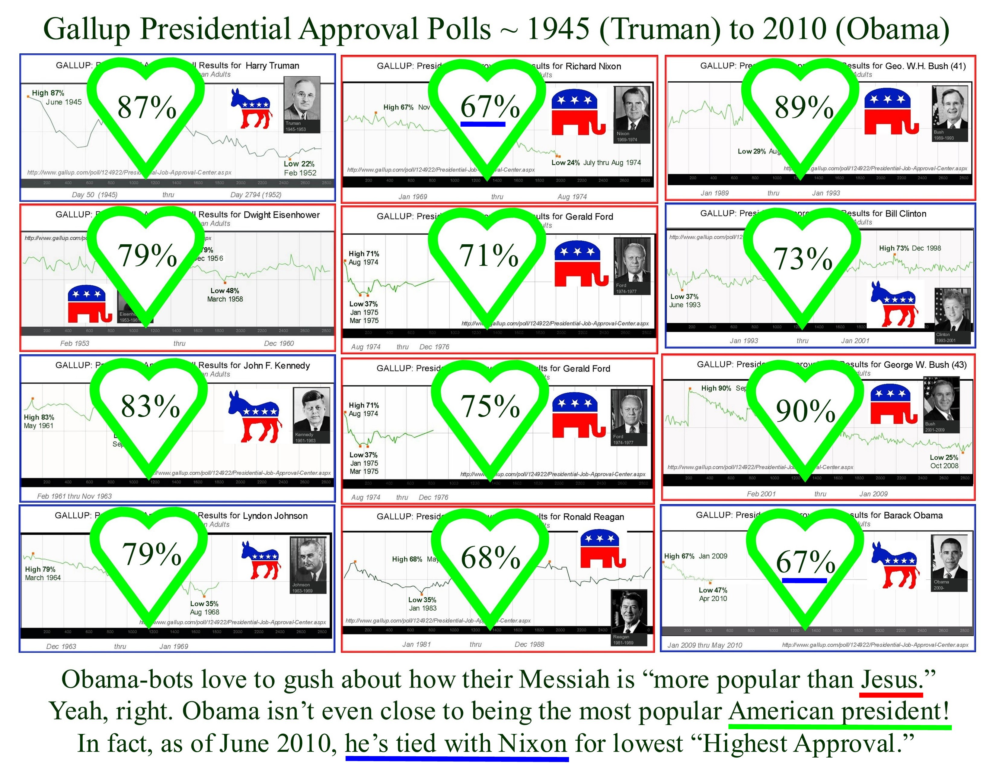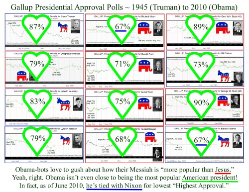 I’ve seen O’bots on the net insisting that he’s the MOST popular president in history when in fact, his HIGHEST ever GALLUP approval rating (67%) is a tie with Richard Nixon’s for the LOWEST highest ever recorded.