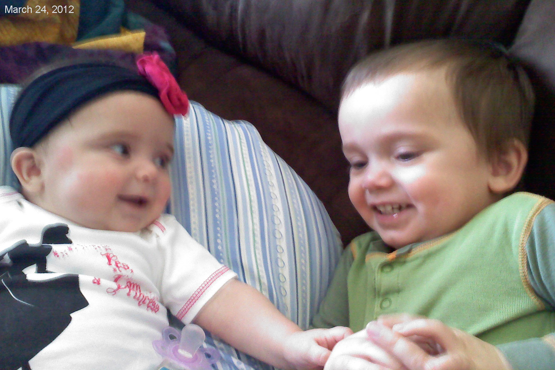 I love how she is reaching for him with her little hand, and looking so engaged!