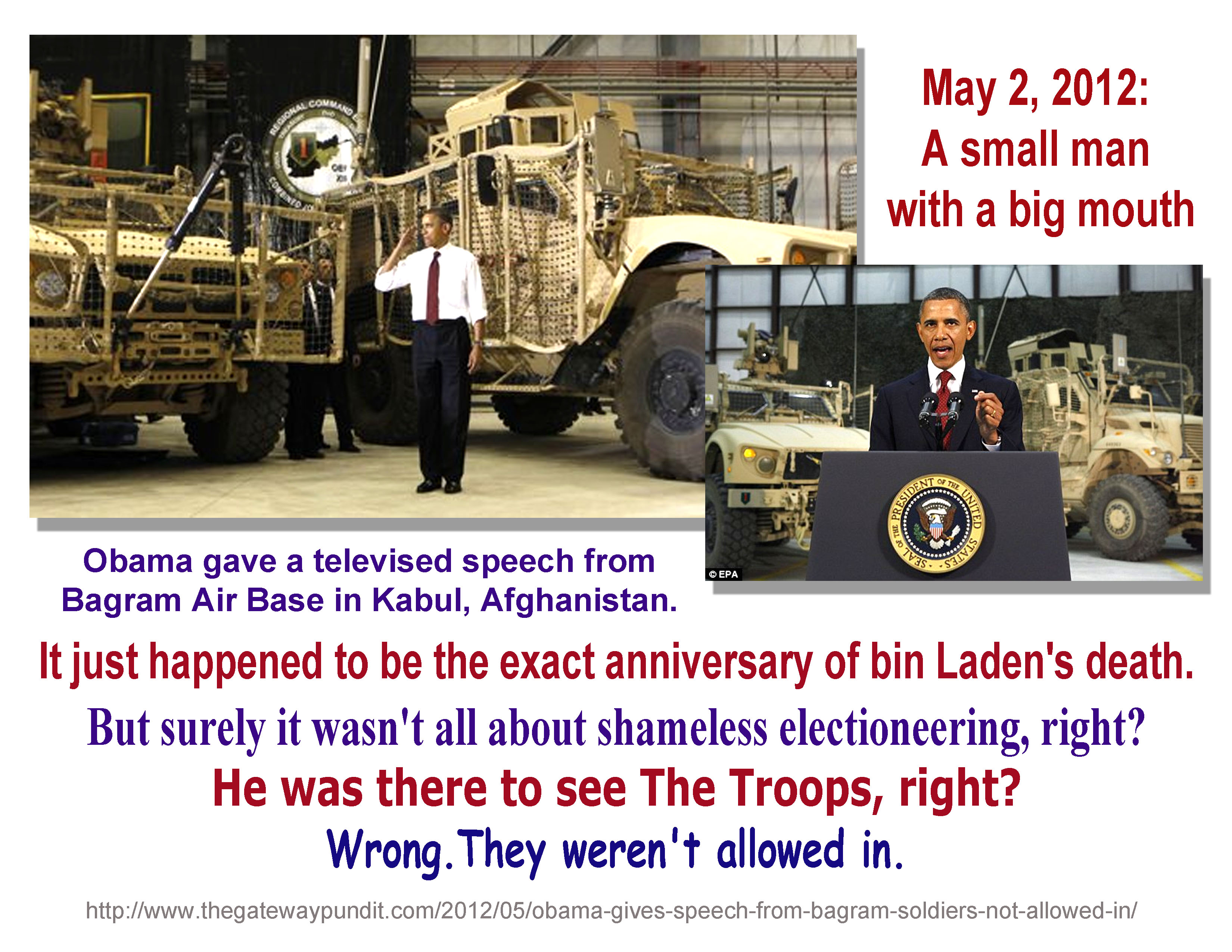 I love the photo of him saluting in front of all those big trucks. It makes him look the petty little buffoon that he is. Military trucks dwarf him. Military men and women are so much bigger than he is that they can’t be allowed anywhere near him.