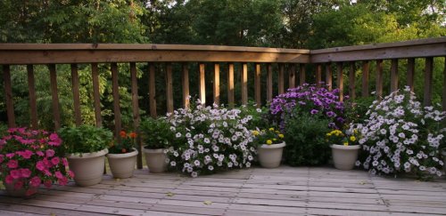 My husband took this picture of my deck garden just a few days ago. The weather for much of the summer has been brutally hot and humid — not very pleasant for human beings, but ideal for petunias, marigolds, evolvulus, and herbs.