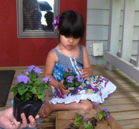 Here are some pictures of my little friend Lily helping me plant flowers. Lily is four years old and has been coming to my house one day a week for most of her life. She loves to help with the gardening, as you can see.