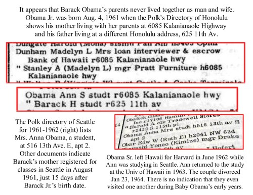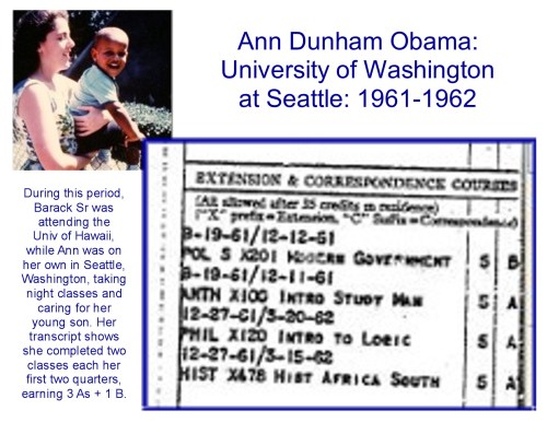 I took Logic too. The way it was taught at my (heavily Marxist) college, it was just geometry without the pictures. I loved geometry and had no trouble with regurgitating the proofs they wanted. So maybe it depends where it’s taught? Also, Obama’s mother has good grades on all her transcripts. She was really bright and loved school. It’s one of the reasons I am so sure she got preggers in Seattle; she attended classes the fall semester of 1960, then did NOT attend any classes spring 1961, but was back in school at the end of August 1961. To me, that looks a whole lot like a single teenager hiding her third trimester tummy and newborn baby at home with her Mom and Dad until he was big enough to take out of the area for a couple years when he would be big enough to pass off as younger than he really is.