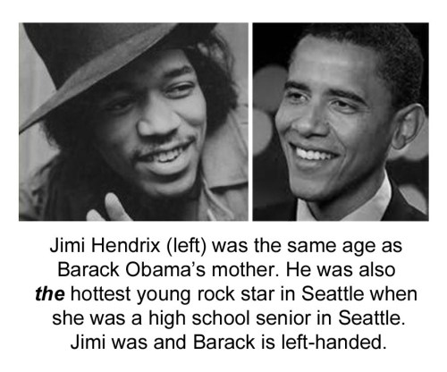 The only thing that could be against that theory is whether or not Jimi Hendrix was in the same place as Ann Dunham. I have no doubt that Ann, being a very forward minx could have been a groupie in every sense of the word.