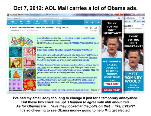 I thought I was the only one going nuts with all the Obama ads on the ISP home pages and mail services and YouTube pages. They are driving me crazy. My mail is on Comcast, and every time I open a stupid message there’s Barack or Michelle grinning at me from the right hand column. I’m ready to bail entirely, but where would I go? All the telecom companies are in the O-column. Grrrrr.