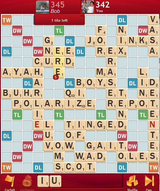 I played U at the top right – UN and NU – for 4 points. We each have one tile left. It’s her turn. ::chewingfingernails::