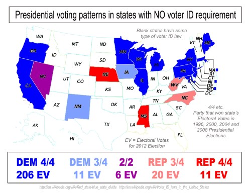 Thanks, Auntie. I just used the Wikipedia maps posted at the top. Running down all 50 states’ voter id laws and past voting patterns was wayyyyyyyyy more work than I cared for! LOL