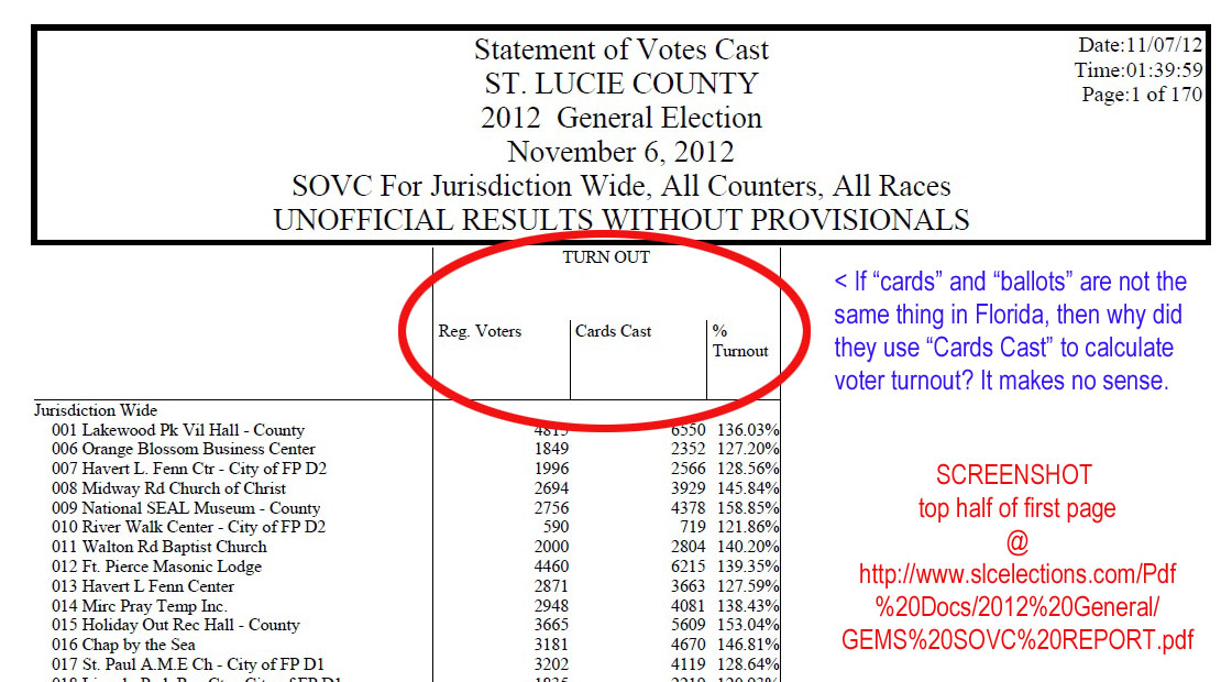 Just one thing … it is hardly as simple as “We’re too dumb to know they had two cards.” As you can see below, the first page of the report shows statistics labeled TURN OUT. Under that are columns for number of Registered Voters, Number of Cards Cast, and Percent of Turnout.