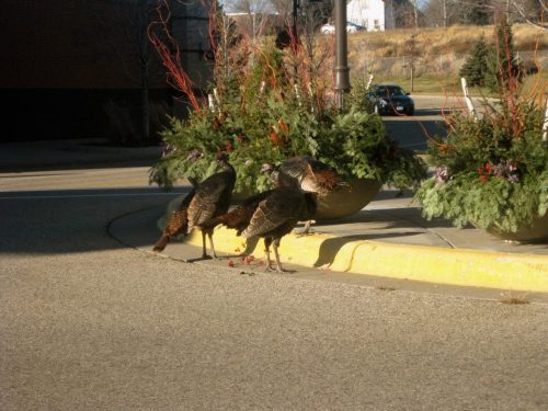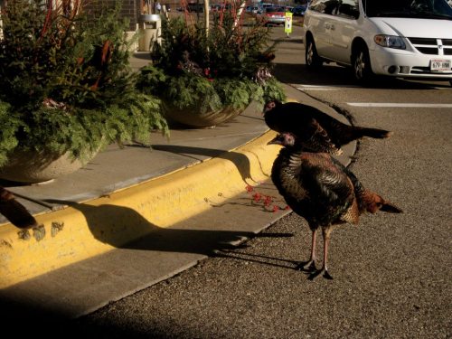 These turkeys have no fear of humans or vehicles. When I went to pick up my daughter, they were standing in the street, and although they glanced up when I honked at them, they didn’t move. I had to sit and wait until they finally decided they felt like crossing the street.