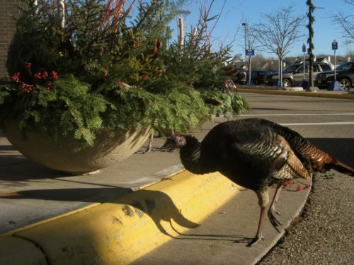 There was a wild turkey downtown MPLS a few years ago…he was just wandering down 7th on his way to Marquette Ave. right down the middle of the street. It was extremely disruptive, because yeah: no fear of cars or people. Finally it flapped up a ramp, into a parking garage. Police arrived, and I was questioned: ‘Ma’am, do you know the turkey’s whereabouts?’ I guess they have had a population boom here in recent years…and some of them are MEAN. Glad your turkey encounter was peaceful, Bob.