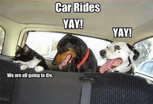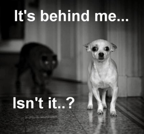 The “It’s behind me… isn’t it?” picture above is a very accurate depiction of how our cat treats our dogs… the cat loves to chase the dogs and bite their hind legs. The older dog is terrified of the cat. The younger dog will actually play with the cat and “soft mouth” bite the cat and the cat meows like it is being hurt when it really isn’t. (When we first got the cat, I didn’t see the cat attack the dog, and only heard the cat cry out… then I would sternly tell the dog to leave the cat alone… it wasn’t until later that I realized that when the dog left the cat alone, the cat would go chase after the dog and try to re-engage the dog, so I knew that the cat wasn’t getting hurt and was in reality the instigator!)
