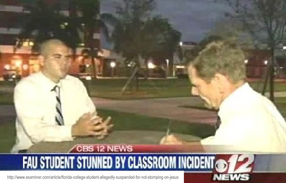 A Florida Atlantic University student has been punished for refusing his professor’s directive to stomp on a piece of paper with the word “Jesus” written on it. The university is defending the assignment as a “lesson in debate” and upholding the professor’s “right” to punish the student for having, you know, faith in Jesus. No word on why the curriculum specifically instructs students to stomp on the name of JESUS … not on, say, MUHAMMED, or BUDDHA, or SHIVA, or OBAMA or ………. you fill in the blanks. Also no explanation for why refusing to stomp was not a valid and/or valuable part of this “lesson on debate.”