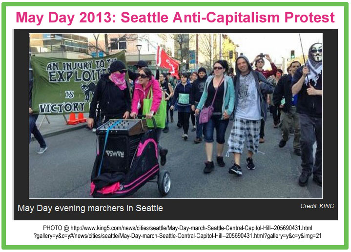 May 1, 2013 (Seattle, WA) – Police were forced to use “flash bangs” and pepper spray against some protesters who pelted them with rocks and bottles during the May Day march in Seattle.