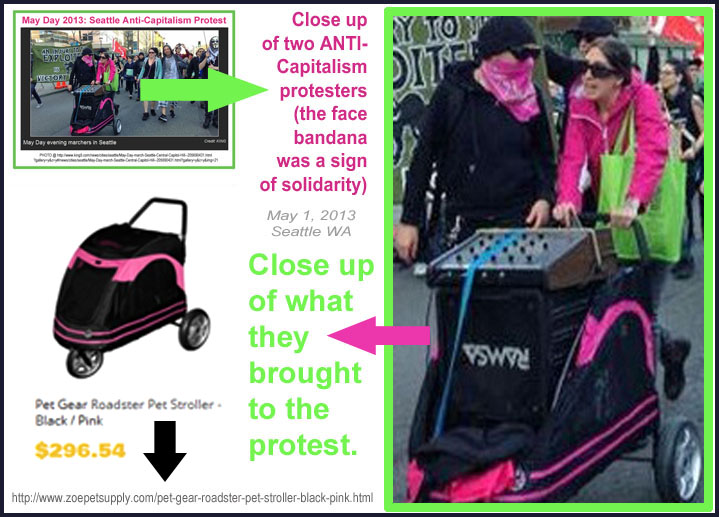 Nothing says SOLIDARITY WITH OPPRESSED WORKERS like color-coordinating your protest ensembles with your dog’s swanky stroller.