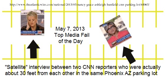 On the morning of May 7, 2013, during an update on the Cleveland kidnapping story, CNN’s Ashleigh Banfield pretended to be doing a satellite interview with Nancy Grace of Headline News. They acted like they were on opposite sides of the world, but in the video, you can see the SAME busses and cars passing behind them!