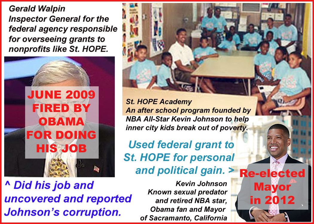 - http://conservativespotlight.com/2012/09/16/33-firing-inspector-general-gerald-walpin-for-investigating-sexual-predator-and-obama-friend-sacramento-mayor-kevin-johnson/