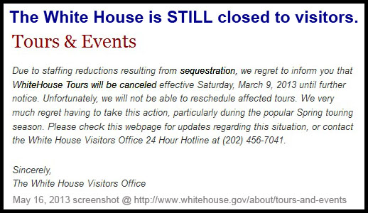 Added by CtH, just cuz I needed to find out for myself if the White Hut really is still closed. Yup. It is. And it’s still being blamed on SEQUESTER, which alert readers will recall is short-hand for “Republicans didn’t let us have as big an increase in federal spending as we wanted WAAAAAH.” One guess why getting MORE money translated into “We can’t afford to let people walk through the White House any more” and “We have to short staff flight towers so planes get delayed.”