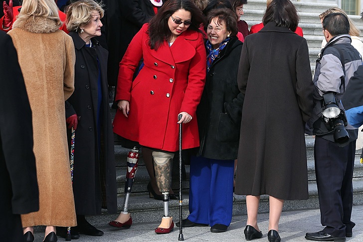 Above: Rep. Tammy Duckworth, D-Ill, lost both her legs and the use of her right arm as a helicopter pilot in Iraq in 2004. She has chronic pain and may still lose her right arm altogether.