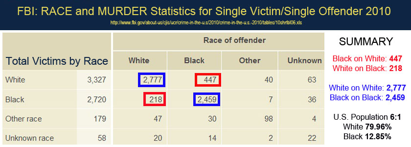 - 2010 murder statistics show black-on-black murder total (2,459) was very nearly as high as white-on-white (2,777).