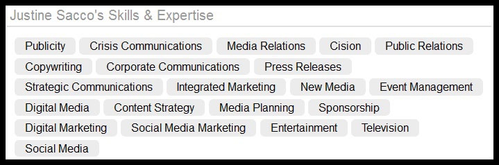 Director of Corporate Communications is head of the Public Relations division. At Linked In, Justine lists these as her special areas of expertise:
