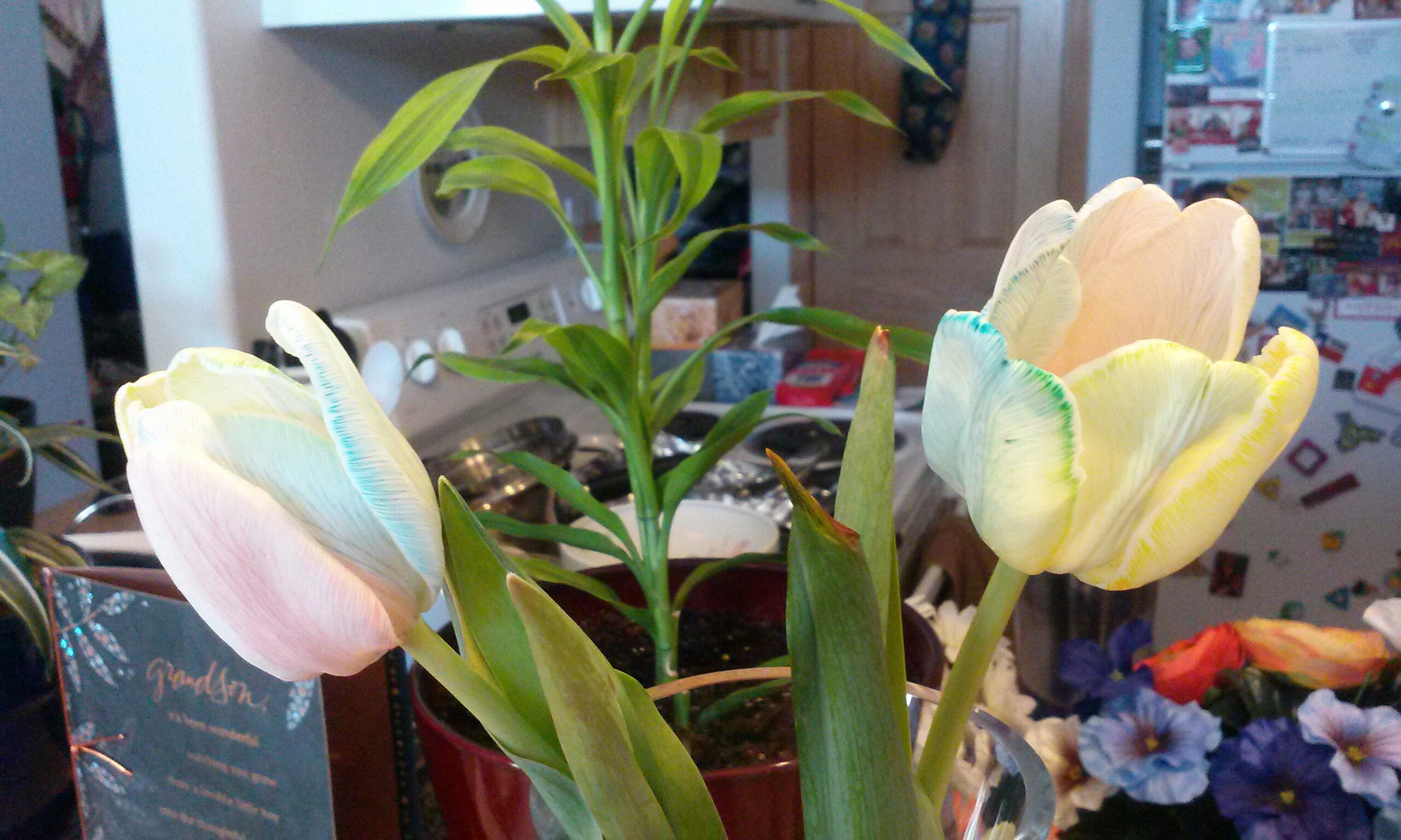 Mama Buzz split white tulip stems and put them into different glasses of colored water. Twenty-four hours later, they were GORGEOUS. What a lovely Easter bouquet this would make!