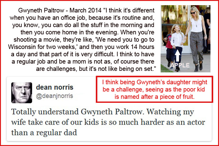 - BREAKING: Gwyneth Paltrow is an out-of-touch fruit loop. Oh wait, everybody already knows that.